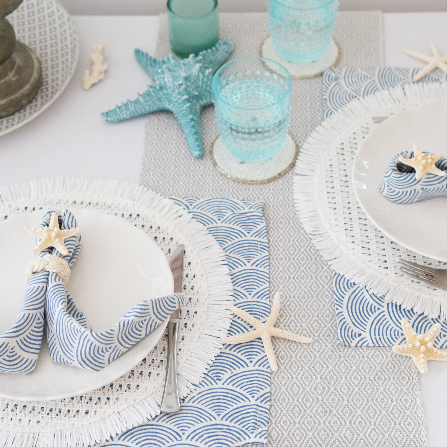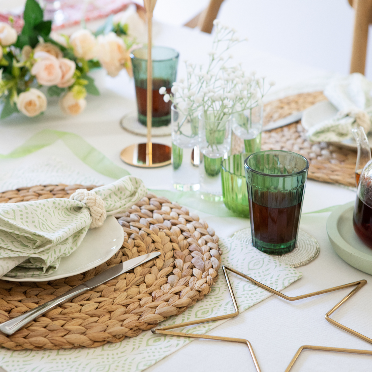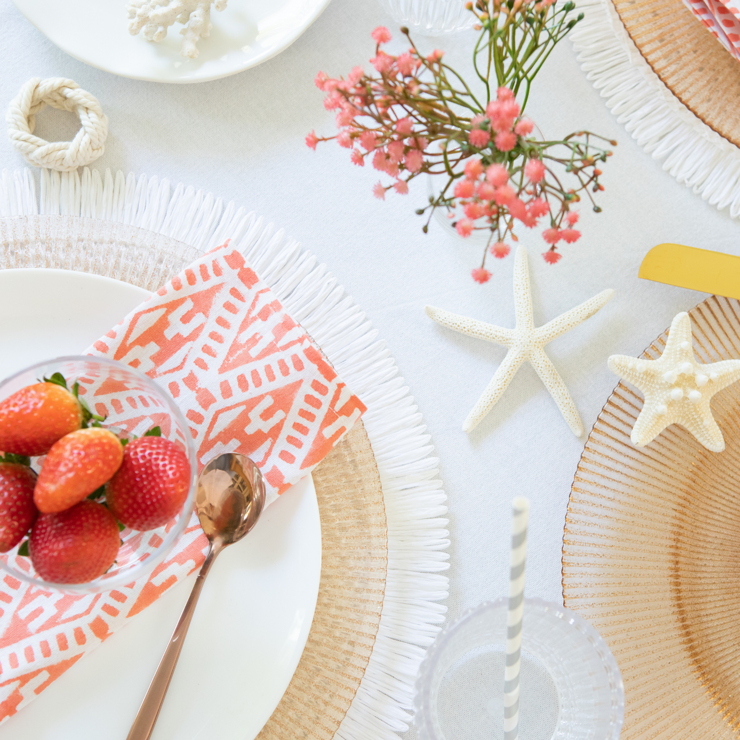 This table linen looks stunning paired with white or peach flowers, for the prettiest Girls Lunch.