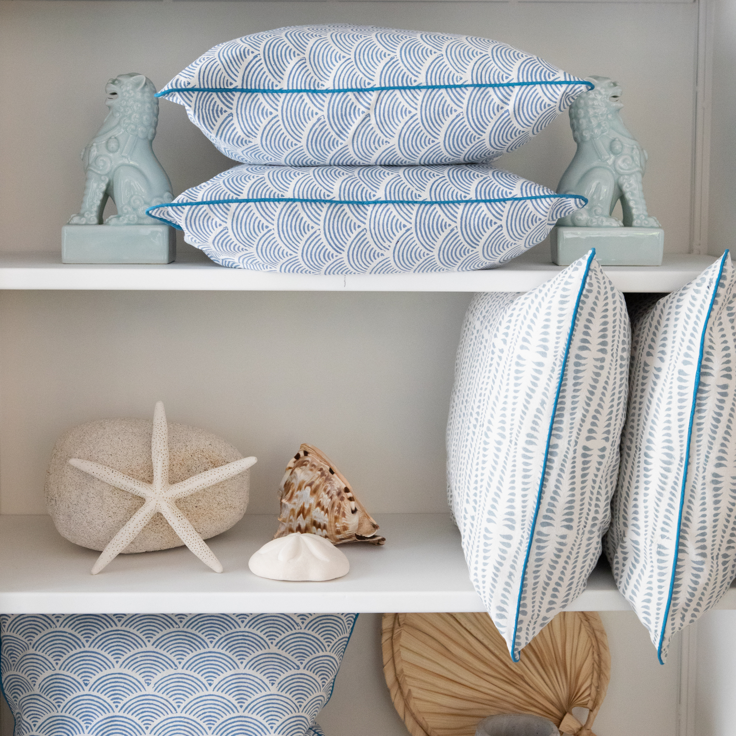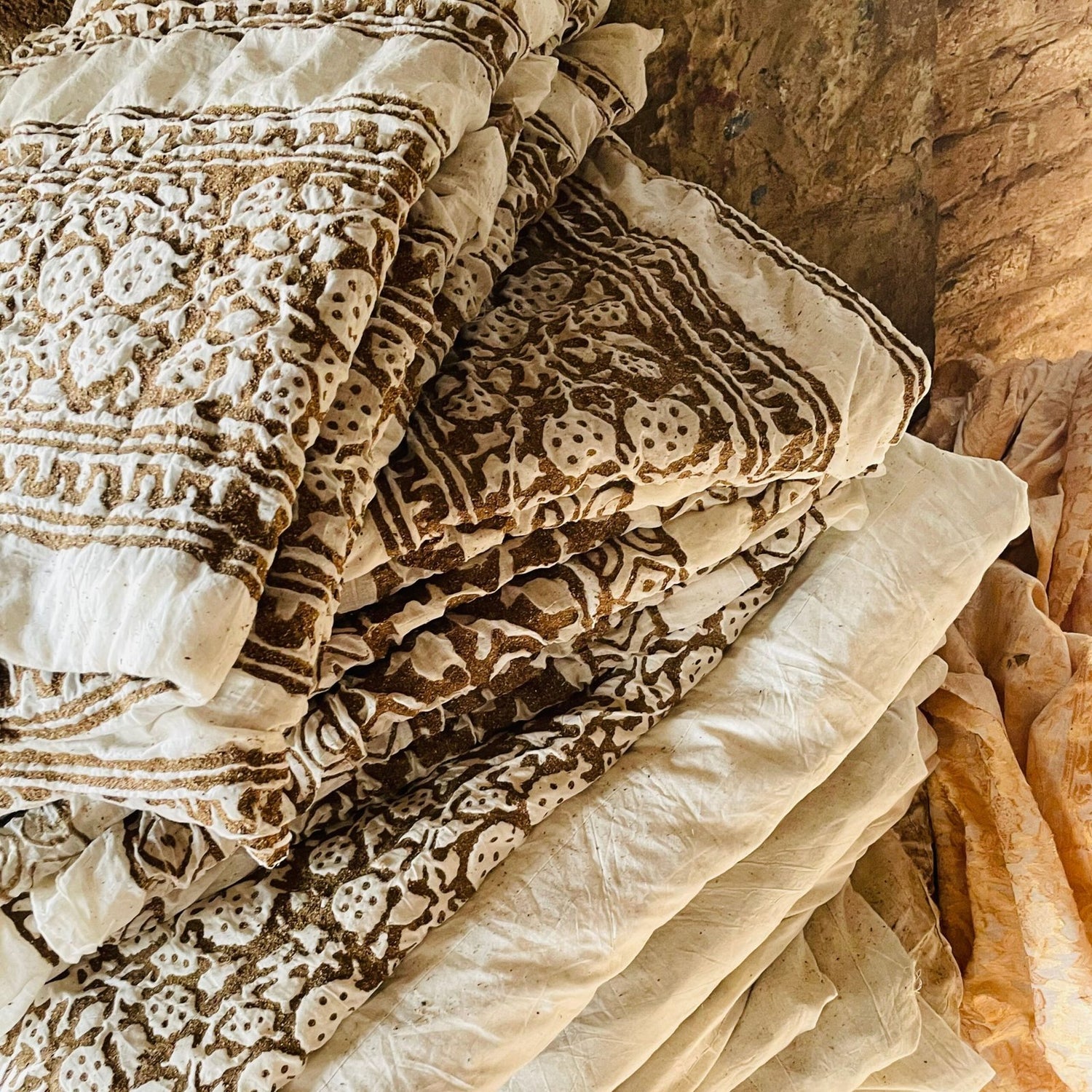 The Rangrez then oversee the drying of the fabric in the hot Rajasthan sun, laid out across the fields and on rooftops. Then the fabric is sewn into the beautiful pieces we have curated for your home.