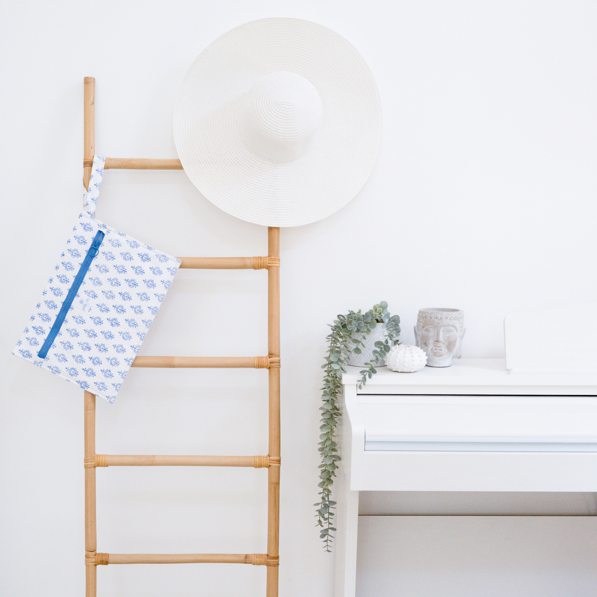 We love the chunky zip, wrist strap, soft quilted exterior and beautiful block print design - a unique Pink City Living creation, we never travel without this Santorini-inspired beauty!